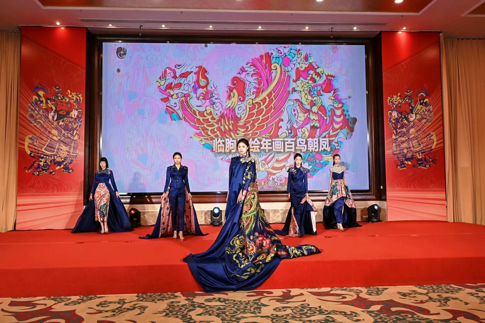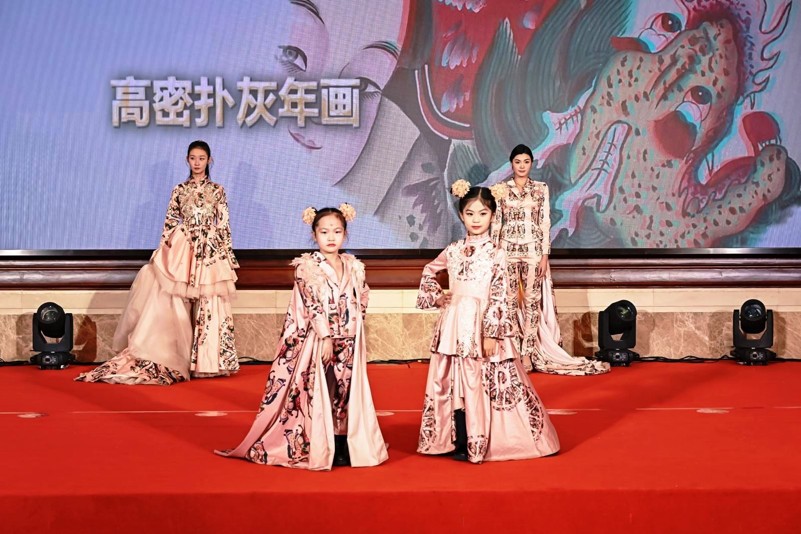 在“年畫走秀”環(huán)節(jié),模特們身著以青州農(nóng)民畫、高密撲灰年畫、臨朐手繪年畫、楊家埠 木 版年畫為設(shè)計(jì)靈感的華服款款而來。這些服裝將傳統(tǒng)年畫元素與時(shí)尚創(chuàng)意融合,生動(dòng)詮釋了濰坊年畫“貼在墻上是年畫,飛在天上是風(fēng)箏,穿在身上是時(shí)尚”的藝術(shù)魅力。