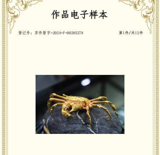 為了證明自身作品的原創(chuàng)性,吳文勝還向視頻發(fā)布方提供了自己的版權(quán)證書等關(guān)鍵材料。經(jīng)過仔細比對,對方認為山姆超市售賣的黃金螃蟹確實極有可能是抄襲了他的作品,隨即在文案中補充了吳文勝的名字,并注明其為原創(chuàng)作者。