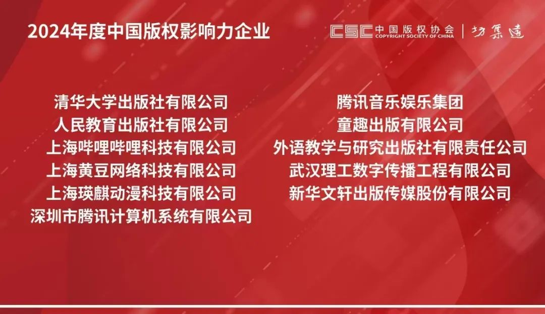 年會公布了2024年度“2024年度中國版權(quán)保護(hù)力企業(yè)”“2024年度中國版權(quán)創(chuàng)新力企業(yè)”“2024年度中國版權(quán)影響力企業(yè)”等名單并授牌。其中,武漢理工數(shù)字傳播工程有限公司分別榮獲“2024年度中國版權(quán)影響力企業(yè)”榮譽稱號。
